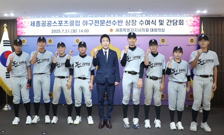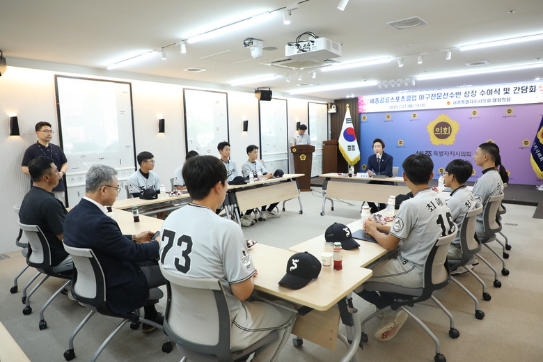 [세종 세계타임즈=이채봉 기자] 세종특별자치시의회(의장 임채성)는 21일 세종공공스포츠클럽 야구 전문선수반 유소년 선수들을 초청해 우수선수상을 수여하며 전국 유소년 야구대회 우승의 성과를 함께 축하하는 자리를 마련했다.