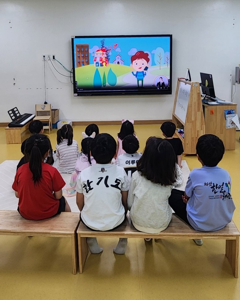6학년 기○○ 학생이 담당자와 함께 시범을 보이고, 1학년 학생들은 지시에 따라 화재진압용 소화기를 사용해 불을 끄는 방법을 배웠다.