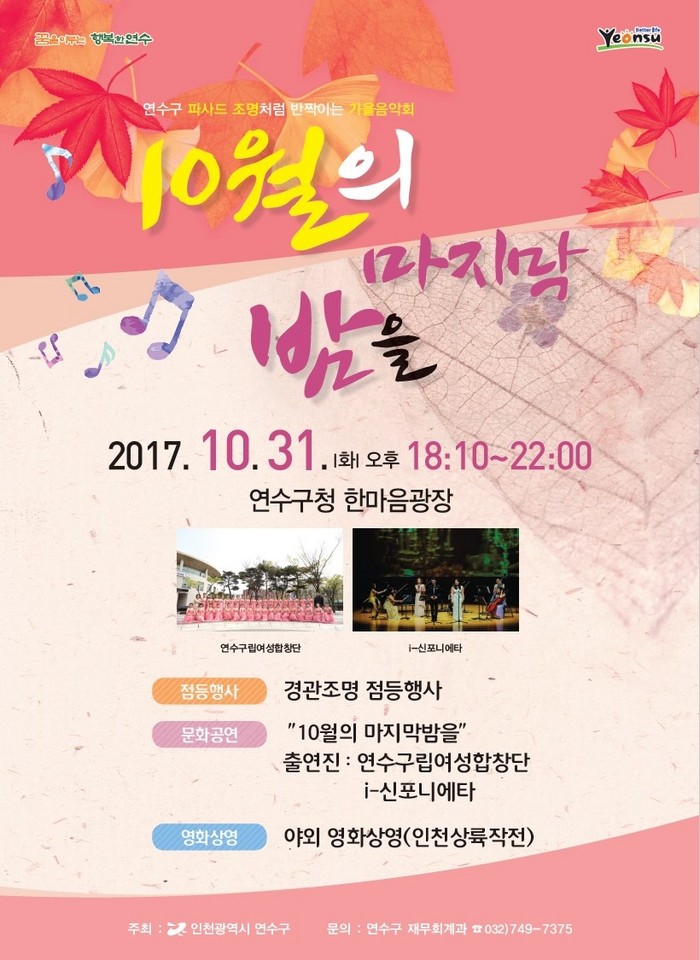 이번 행사는 경관조명 점등식을 시작으로 연수구립여성합창단과 아이신포니에타 악단의 공연이 주민들의 마음을 따뜻이 적신다. 이어 초대가수 이용이 10월의 마지막 날 듣는 시즌송인 자신의 히트곡 ‘잊혀진 계절’ 등을 부르며 가을저녁에 낭만을 선사한다.