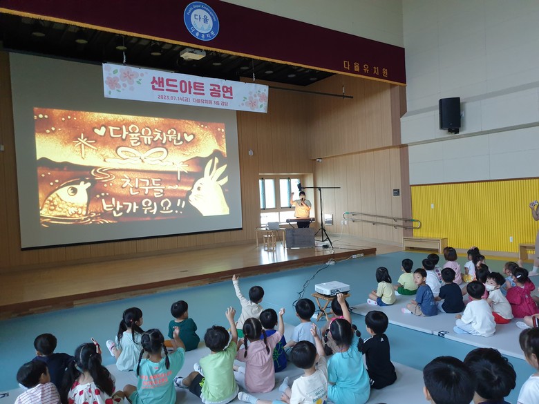 이번 공연은 놀이 중심 교육과 연계된 다양한 교육 경험 제공을 위해 샌드아트 전문가를 초빙하여 본교 강당에서 2부로 나누어 진행됐다. 빛과 모래를 이용한 신비롭고 아름다운 공연은 유아들에게 흥미로운 감동과 함께 모래 그림의 변화 과정을 관찰하며 어떤 생물일지 상상하는 즐거움도 안겨주었다.