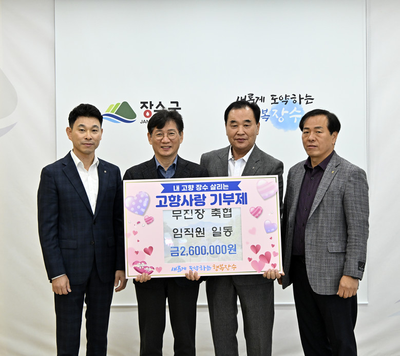 최훈식 장수군수는 “매년 잊지 않고 고향사랑기부제에 함께해주신 무진장축협 임직원 여러분께 깊이 감사드린다”며 “보내주신 소중한 기부금은 장수군의 더 나은 미래를 위해 군민 복지와 지역 발전에 의미 있게 사용하겠다”고 밝혔다.