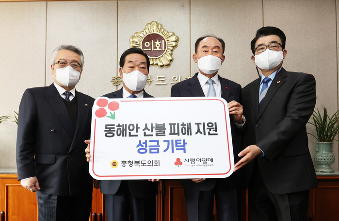 이날 박문희 의장은 집무실에서 이상욱 의회운영위원장, 최경천 대변인이 참석한 가운데 위로와 온정을 담은 성금을 충청북도사회복지공동모금회(회장 노영수)에 전달했다.