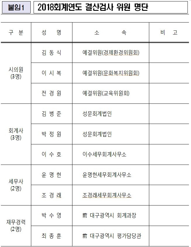 이번 검사를 위해 대구시의회(의장 배지숙)는 2일 오전 시의원 3명(김동식, 이시복, 전경원), 공인회계사 3명, 세무사 2명, 재무경력자 2명 등 모두 10명으로 구성된 결산검사 위원들에게 위촉장을 수여하였으며, 대표위원으로는 경제환경위원회 김동식 의원(수성2)이 선임되었다.