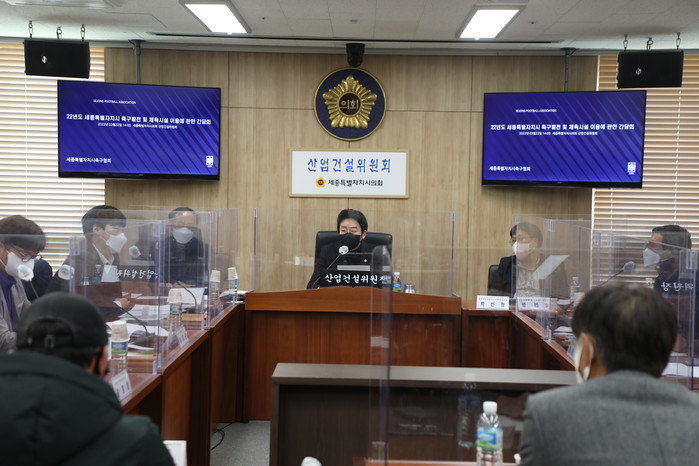 [세종=세계타임즈 이채봉 기자] 세종특별자치시의회 임채성 산업건설위원장은 3월 22일 산업건설위원회 회의실에서 세종시 축구협회 관계자와 축구장 이용 편익 증진 및 유소년 축구 활성화 방안 등에 대해 논의하는 시간을 가졌다.
