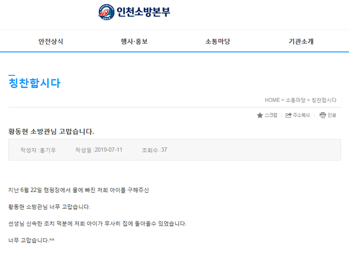 이런 황동현 소방장의 선행은 아이의 부모가 11일 인천소방본부 홈페이지 ‘칭찬합시다’코너에“소방관님의 신속한 조치 덕분에 아이가 무사히 집에 돌아올 수 있었다”며 고마움을 표현하는 글을 올려 알려지게 되었다.