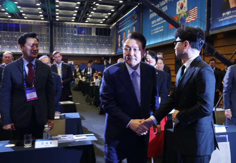 윤석열 대통령이 27일 서울 중구 대한상공회의소에서 문화일보 주최로 열린 문화미래리포트2024에서 국민의힘 한동훈 대표와 인사 뒤 행사장을 떠나고 있다. 2024.8.27
