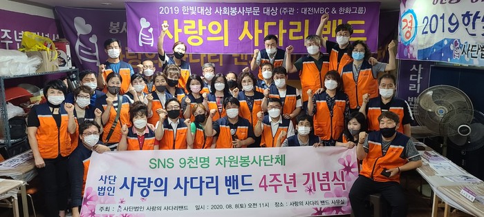 [대전=세계타임즈 이채봉 기자] “오직 진정한 봉사를 실천한다!”는 취지로 2016년 8월 8일 시작한 대전시 SNS 봉사단체 사단법인 사랑의 사다리 밴드(리더 이정제)가 `9천명 회원가입`이라는 대기록을 달성하면서 창립4주년을 맞아 더 큰 봉사를 다짐하고 나섰다.