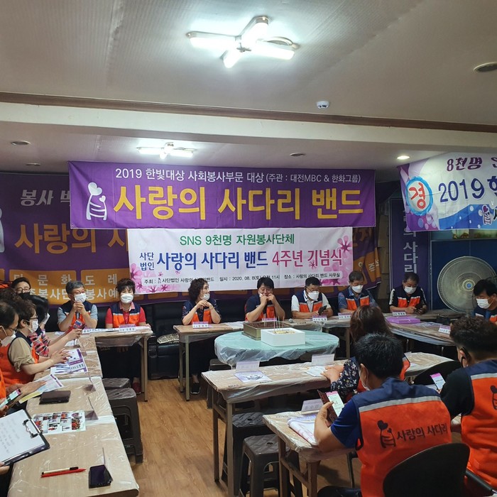 지난 8일 오전 11시,창립 4주년 기념행사는 코로나 19로 인하여 사랑의 사다리 밴드 산하 12개 봉사단체의 40명 임원진만 대덕구 중리동에 위치한 사랑의 사다리 밴드 사무실에 참석하여 지난 4년을 뒤돌아보면서 앞으로 더 나은 봉사활동을 다짐하였다.