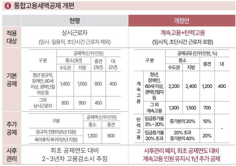 고용을 늘리면 고용주의 세금을 감면해주는 제도인 통합고용세액공제가 전면 개편되는 것도 주목할 부분이다.기존의 상시근로자 중심 지원에서 근로기간 특성을 반영, 계속고용과 탄력고용이라는 개념으로 전환한다.1년 이상 통상의 근로자인 '계속고용'에 대해서는 고용증가 인원에 대한 지원액을 상향 조정하고 기간제 또는 단시간 고용인 '탄력고용'에는 인건비 지출 증가분에 대해 정률 지원하고 임시직·초단시간 근로자까지 지원 대상을 넓힌다는 개념이다.