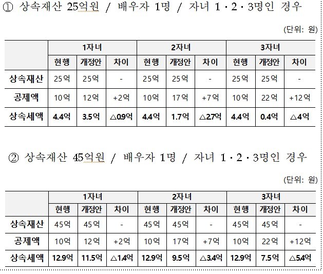최상목 부총리 겸 기획재정부 장관은 사전 브리핑에서 이번 세법개정안은 향후 5년에 걸쳐 약 4조4천억원의 세수감소를 가져올 것이라며 올해 국세수입이 어려운 상황이지만, 2025년 이후 수출 증가에 따른 기업실적 호조, 투자촉진 등의 정책효과가 나타난다면 전반적 세수 여건이 개선될 것이라고 말했다.최대 쟁점은 상속세 개편이다.물가·자산가격 변화를 반영하고 조세체계를 합리화하는 차원에서 세율·과표 및 공제를 모두 조정하겠다는 게 세제당국 입장이다. 연말 국회를 통과해 2025년부터 과표·세율이 조정된다면, 2000년 이후 25년 만의 개편이다.현재 ▲ 1억원 이하 10% ▲ 1억~5억원 20% ▲ 5억~10억원 30% ▲ 10억~30억원 40% ▲ 30억원 초과 50%의 세율이 각각 부과된다.이를 ▲ 2억원 이하 10% ▲ 1억~5억원 20% ▲ 5억~10억원 30% ▲ 10억원 초과 40%로 조정하기로 했다. 즉, 10% 과표구간을 1억원에서 2억원으로 높이고 '30억원 초과 50%' 구간을 아예 없애겠다는 얘기다.공제에서는 자녀공제를 현행 1인당 5천만원에서 5억원으로 10배 상향하기로 했다.자녀공제(기초공제 포함)와 일괄공제 중에서 선택할 수 있는데, 자녀 6명까지는 일괄공제 5억원(자녀 0.5억x6명 및 기초공제 2억원)을 넘지 못하기 때문에 사실상 자녀공제의 실효성이 없는 현실을 고려한 것이다.배우자공제 5억~30억원(법정 상속지분 한도), 일괄공제 5억원은 현행대로 유지된다.가령, 상속재산 25억원에 배우자 1명·자녀 2명이라면 기존에는 배우자공제와 별도로 일괄공제 5억원만 받았지만, 앞으로는 자녀공제 10억원 및 기초공제 2억원까지 12억원 공제를 선택할 수 있다.이렇게 되면 공제액이 7억원 증가하고 상속세는 2억7천만원(배우자공제 5억원 기준) 줄어든다고 기재부는 설명했다.