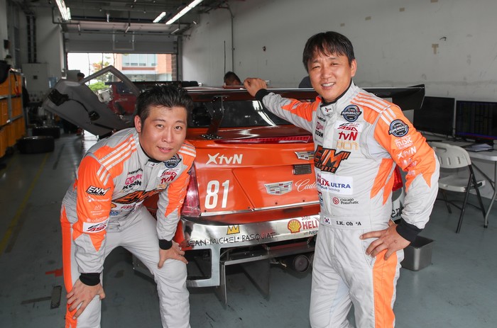 [사진설명] ENM모터스포츠의 오일기(오른쪽)가 16일 코리아인터내셔널서킷에서 진행된 3차 오피셜 테스트에서 이날 최고 랩 타임을 기록한 뒤 팀 동료인 정연일과 기념촬영하고 있다.