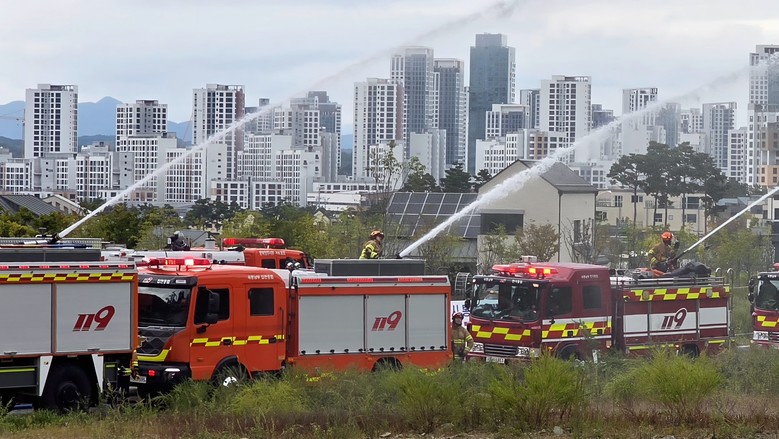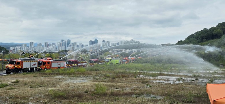 훈련 장비는 펌프차 등 소방차와 레미콘, 살수차 등 24대 차량과 드론과 이동식 수조가 투입됐으며, 세종시 긴급구조통제단 및 통합지원본부를 가동해 재난대응 체계 운영능력을 점검했다.