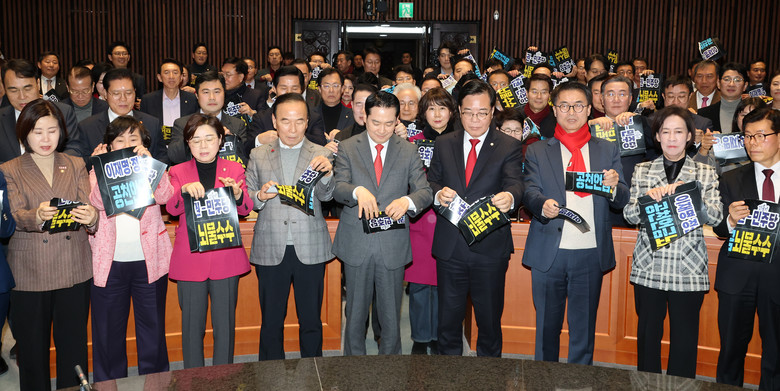 장동혁 대표와 송언석 원내대표를 비롯한 참석자들이 13일 국회에서 열린 국민의힘 국회의원·당협위원장 연석회의 및 의원총회에서 공천 헌금과 뇌물 수수를 규탄하는 구호를 외친 뒤 봉투 모양의 피켓을 찢는 퍼포먼스를 하고 있다. 2026.1.13