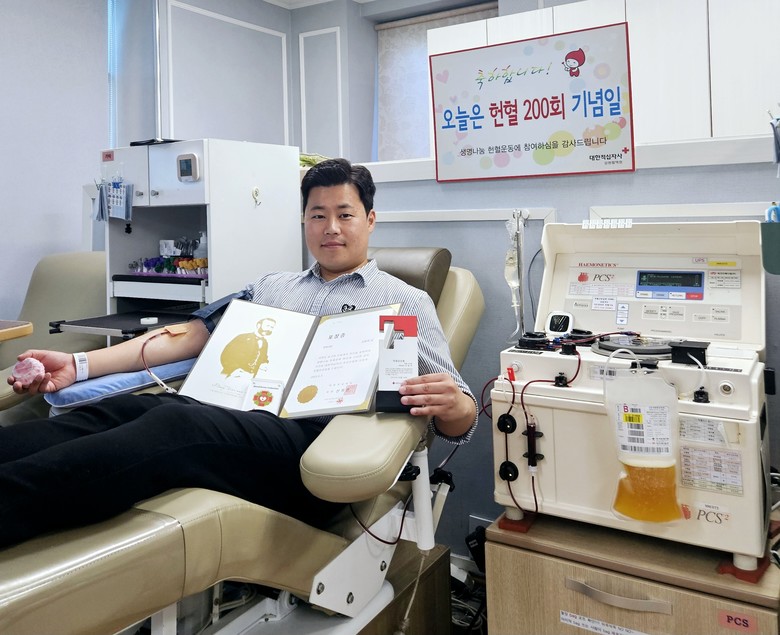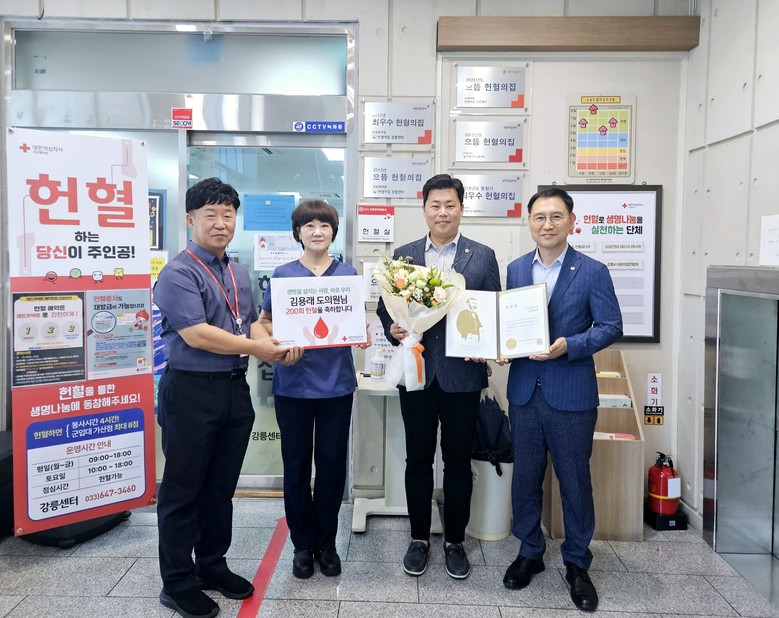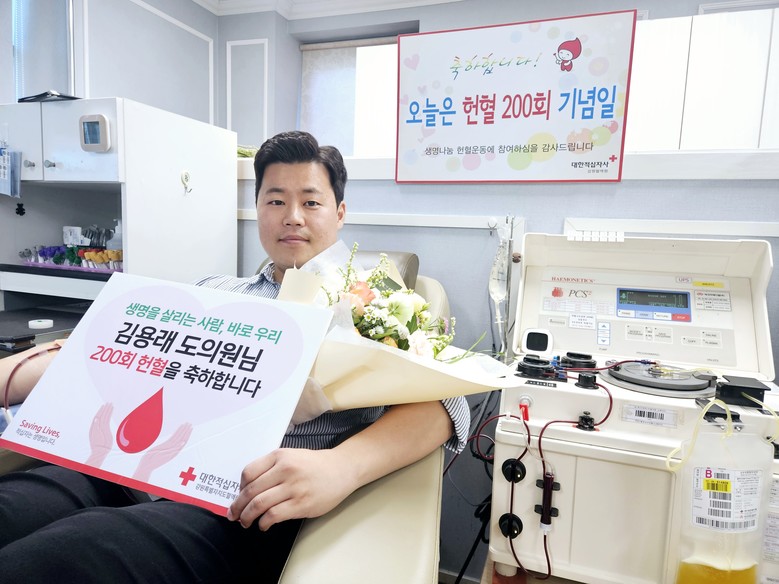 대한적십자사 강원특별도지사혈액원은 8월 3일 본인의 생일을 맞아 200번째 헌혈을 실천한 김 의원에게 헌혈문화 확산과 국가 혈액 사업 발전에 기여한 공로로 강원특별자치도혈액원장 표창을 수여했다.