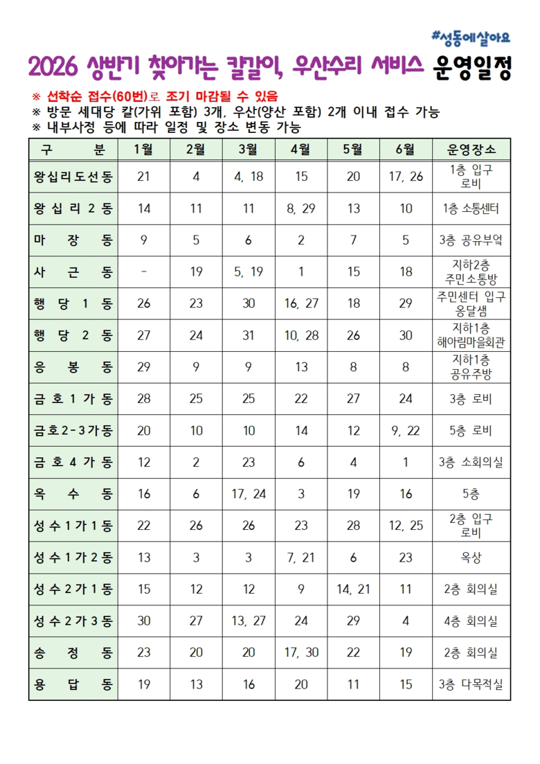 구는 주민들의 이용 편의를 높이기 위해 매월 1~2회 17개 동 주민센터를 순회하며 ‘찾아가는 칼갈이·우산수리 서비스’를 운영하고 있다. 올해 상반기 운영기간은 1월 9일부터 6월 30일까지이며, 운영시간은 평일 오전 9시부터 오후 5시 30분까지(접수 마감 오후 4시 30분)다.