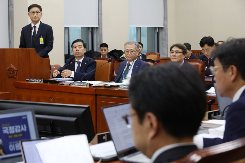 윤태양 삼성전자 부사장이 22일 국회에서 열린 환경노동위원회 국정감사에 출석, 의원 질의에 답하고 있다. 오른쪽은 박종길 근로복지공단 이사장과 안종주 한국산업안전보건공단 이사장. 2024.10.22