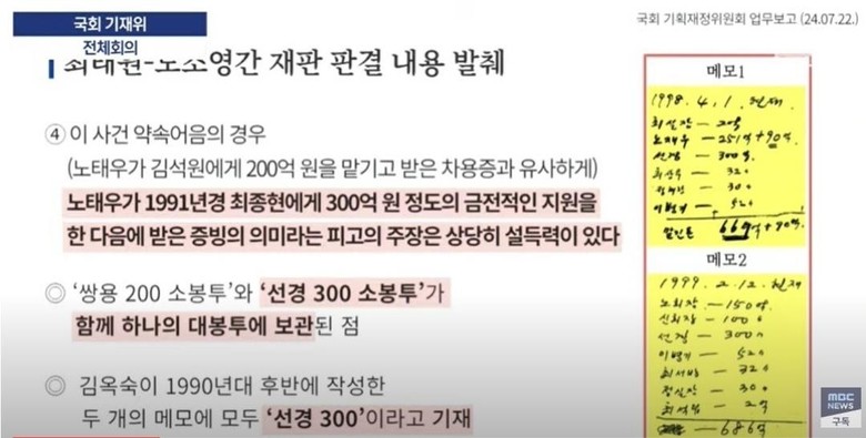 노 전 대통령의 부인 김옥숙 여사가 보관해온 1991년 선경건설(SK에코플랜트 전신) 명의 약속어음과 메모도 등장했다. 앞서 항소심 재판부는 이 메모를 근거로 노 전 대통령의 자금 300억원이 최 회장의 선친인 최종현 전 회장에게 흘러 들어갔다고 판단한 바 있다.임 의원은 이 300억원이 노 전 대통령의 차명재산이나 유효한 채권이라면 2021년에 사망한 노 전 대통령의 상속재산에 포함돼야 한다며 이것을 빨리 조사해서 유효한 채권인지 차명재산인지 증여인지 밝혀야 하지 않느냐고 지적했다.