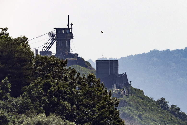 군이 북한의 대남 오물 풍선 살포에 대응해 6년 만에 대북 확성기 방송을 재개한 가운데 10일 오후 경기도 파주시 접경지역에서 위장막이 기존 대북 방송 확성기가 있었던 군사 시설물 주변에 설치되어 있다.[사진=연합뉴스]