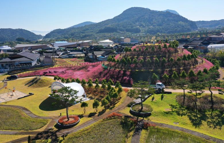 황금실화백나무는 잎이 황금색인 사철나무로 공원 일원에 만개한 핑크뮬리와 어우러져 색다른 장관이 연출되고 있다.
