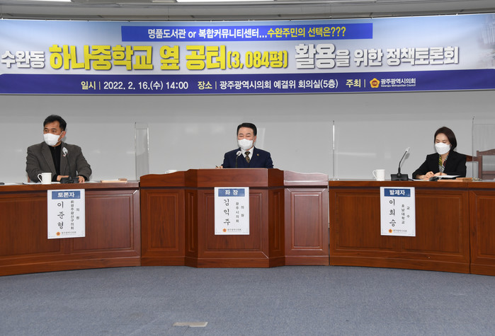 그래서 김 의원은 민의를 반영 하기 위해 지난해 10월 시정질문을 통해 이용섭 광주시장으로부터 주민들의 숙원 사업 추진 확답을 받아냈고, 나아가 2022년 본예산에 사업 추진 용역비 3억 원을 확보해 냄으로써 공터 활용방안을 위한 정책토론회를 개최하게 되었다고 추진 배경을 밝혔다.