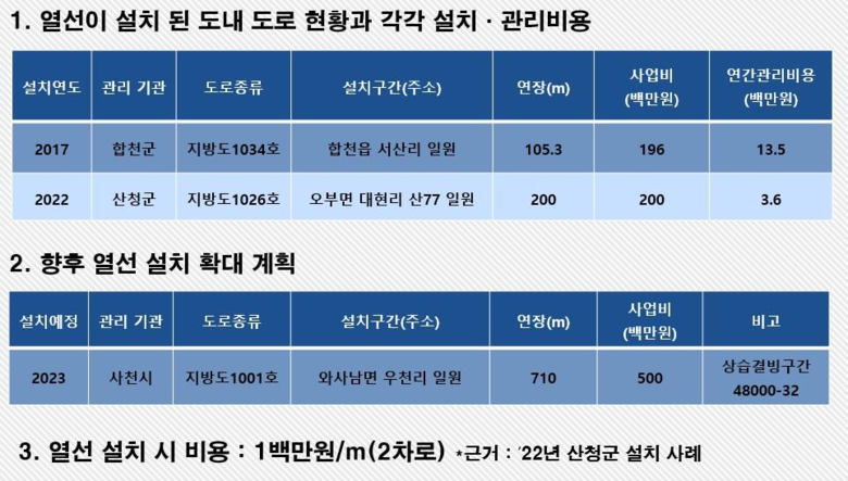 이어 “비용이 문제인데, 2차로 기준 미터 당 100만 원으로 추산되므로 점진적으로라도 열선 설치를 확대해 경남에서만큼은 무작정 당할 수밖에 없는 블랙아이스 사고를 미연에 방지해야 한다”며“관리비용은 국비 지원을 요청하는 등 방안을 고민해볼 수 있다”고 주장했다.