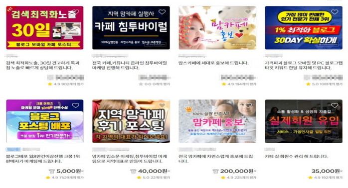 또한 기자는 최근 “프리랜서몰 ‘크몽’에 블로그에 포스팅을 써준다”는 광고를 게시했다. 크몽 사이트에는 블로그나 사이트에 상위 노출이 되는 후기성 포스팅을 써준다는 홍보글이 상당히 많았다.