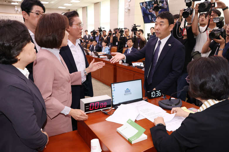 22일 서울 여의도 국회 법제사법위원회에서 열린 '건진법사 관봉권 띠지' 분실 관련 검찰개혁 입법청문회에서 국민의힘 나경원 의원 등 위원들이 추미애 위원장의 질서유지권 발동 등에 항의하고 있다.