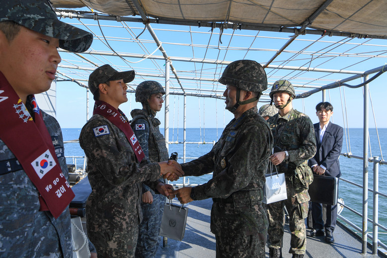 진영승 합참의장이 8일 해군 전진기지대를 방문해 서해 최전방해역 사수를 위한 대비태세를 점검한 뒤 장병들을 격려하고 있다. 2025.10.8 [합참 제공]