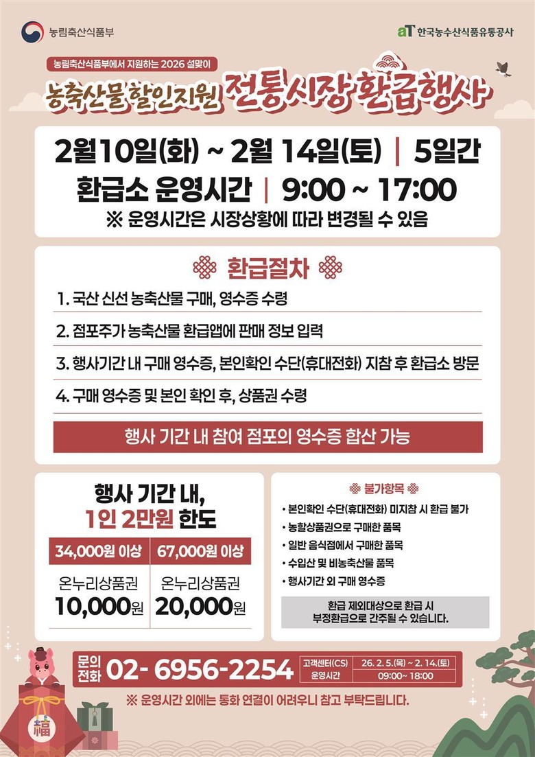 울산시 관계자는 “이번 환급 행사를 통해 설 명절 기간 시민의 장바구니 부담을 덜고 전통시장에 활력을 불어넣는 계기가 되길 기대한다”며 “시민 여러분이 안전하게 장을 볼 수 있도록 시설 안전과 물가 관리도 철저히 챙기겠다”고 말했다.