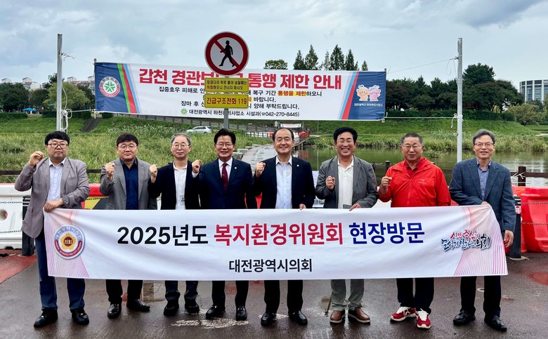이어서 집중 호우시 안전난간, 데크 등 시설물이 반복적으로 파손 및 부식되어 이용 시민들의 불편이 큰 갑천 경관보도교를 방문했다. 이 자리에서는 하천관리사업소장으로부터 현황 설명을 청취하고, 보도교의 지속적인 파손을 방지하기 위해서는 물에 강한 철근 콘크리트 교량으로의 재설치가 필요하다는 데 공감했다. 아울러, 이용 시민 불편 최소화와 안전에 각별히 힘써 줄 것을 당부했다.