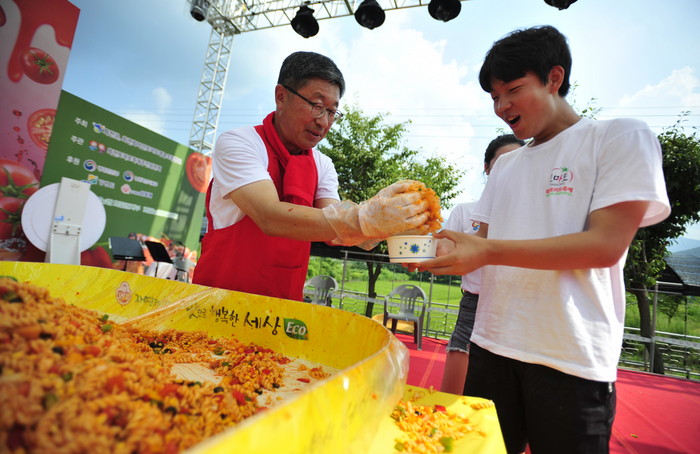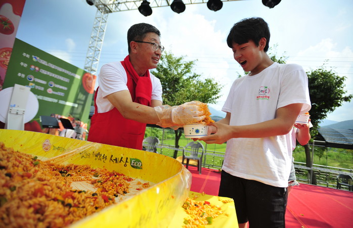 2018 화천토마토축제 이틀째인 3일 사내면 문화마을에서 열린 '천인의 식탁' 이벤트에서 지순식 화천부군수가 관광객들에게 파스타를 나눠주고 있다. 이번 행사는 (주)오뚜기 후원으로 진행됐다.