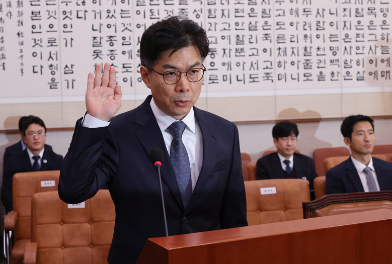 마용주 대법관 후보자가 26일 오전 서울 여의도 국회에서 열린 인사청문회에서 선서하고 있다. 2024.12.26