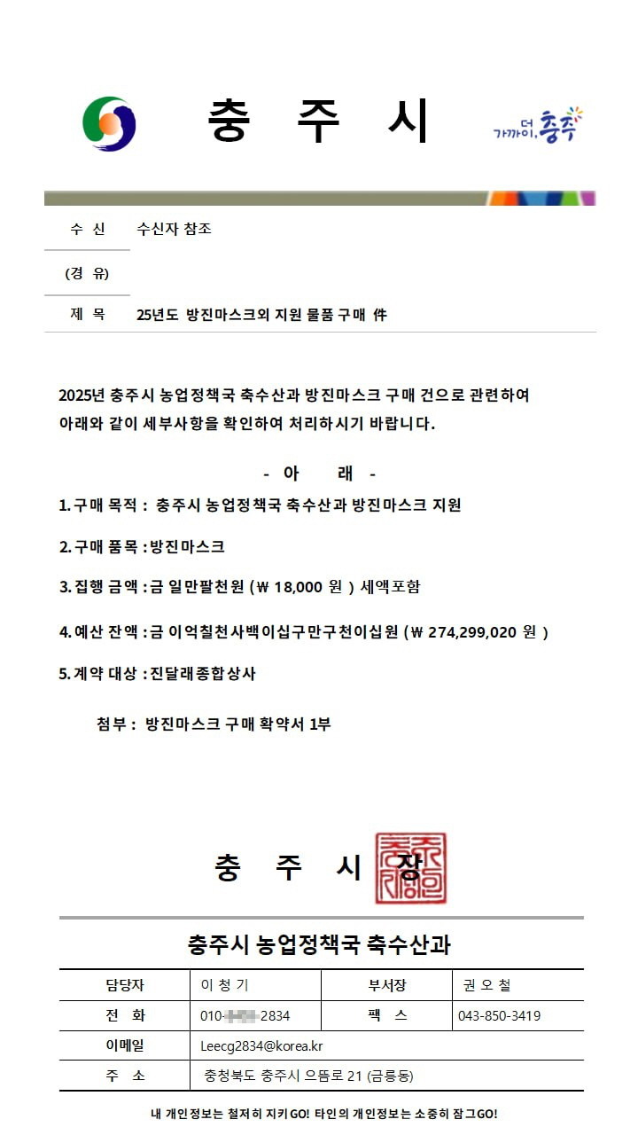 - “거액 거래 전 신분·소속 확인 필수… 의심 사례 즉시 신고해야” - [세계타임즈=충주시 이현진 기자] 충주시가 최근 지역 내에서 연이어 발생한 방진마스크 및 방역복 대리구매 사기 시도 사건과 관련해 시민들에게 각별한 주의를 당부했다.