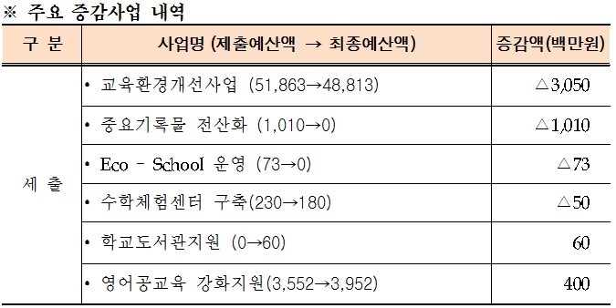 안전하고 쾌적한 교육환경을 위한 교육환경개선사업은 내년도 사업 진행 결과에 따라 확대할 것을 권고하며 18억 5,000만원 삭감, 2002년 이전 생활기록부 전산화 추진을 위한 중요기록물 전산화사업은 교당 생활기록부 발급건수가 4~5건으로 실적이 미미하여 사업실효성 여부를 검토 할 것을 권고하며 10억 1,000만원 전액 삭감하였고, 영어 공교육 활성화 방안의 일원으로 스마트기기를 활용한 외국어 교육활성화사업 4억원 등은 증액하여 가결하였다.