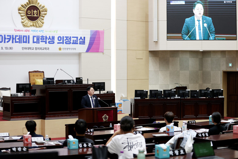 인하대학교 학생 17명은 19일 인천시의회에서 열린 ‘의정 아카데미’에 참여해 모의국회 의정 체험, 5분 자유발언, 의회의 역할과 기능 등 다양한 체험 프로그램을 진행했다.