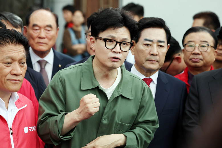 국민의힘 한동훈 대표가 18일 오전 전남 곡성기차마을전통시장에서 상인들과 만나 10·16 재보궐선거 곡성군수 재선거 최봉의 후보의 낙선 인사를 하고 있다. 2024.10.18