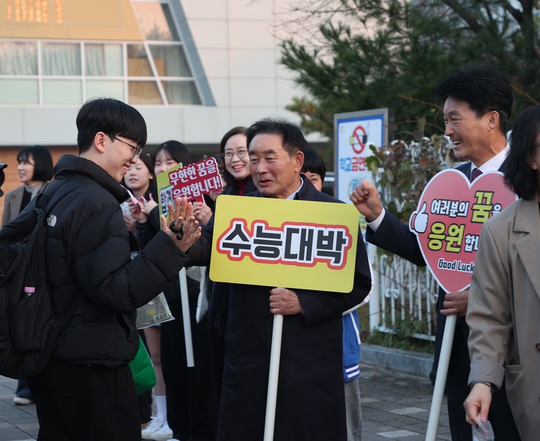 이날은 송기섭 군수가 직접 이른 아침부터 시험장을 찾아 수험생에게 따뜻한 인사로 응원했으며, 시험장 밖에서 자녀를 기다리는 학부모들에게도 감사의 마음을 전하는 시간을 가졌다.