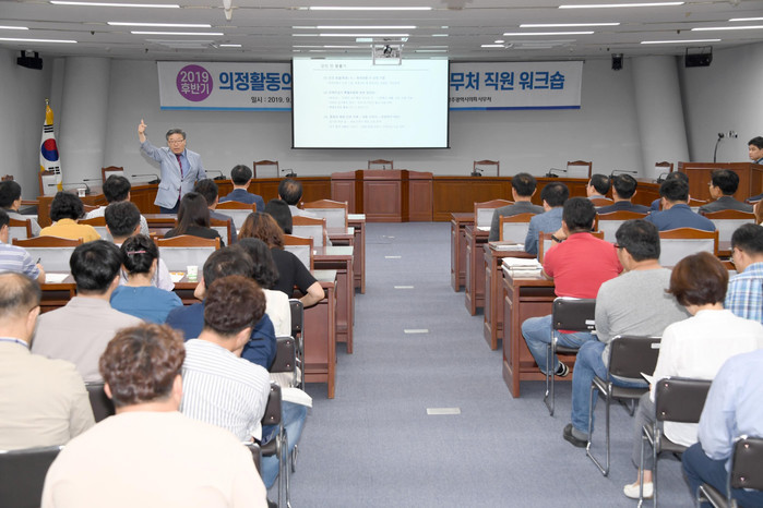 워크숍은 최민수 국회사무처 의정연수원 교수의 ‘지방의회 운영 및 의사진행방법’과 문범수 의회사무처장의 ‘일하는 방식의 혁신방법’을 주제로 한 특강과 부서별 현안업무 공유 등의 내용으로 진행됐다.