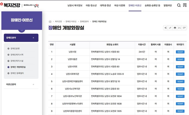 장애인 이용 가능 화장실 정보는 시 대표 누리집(https://www.namwon.go.kr) 접속 후 분야별 정보 ⇒ 복지 건강 ⇒ 장애인 분야 ⇒ 장애인 개방화장실로 들어가 이용 시간, 소재지, 휠체어 진입 여부, 장애인 표식 유무 등을 확인할 수 있다.