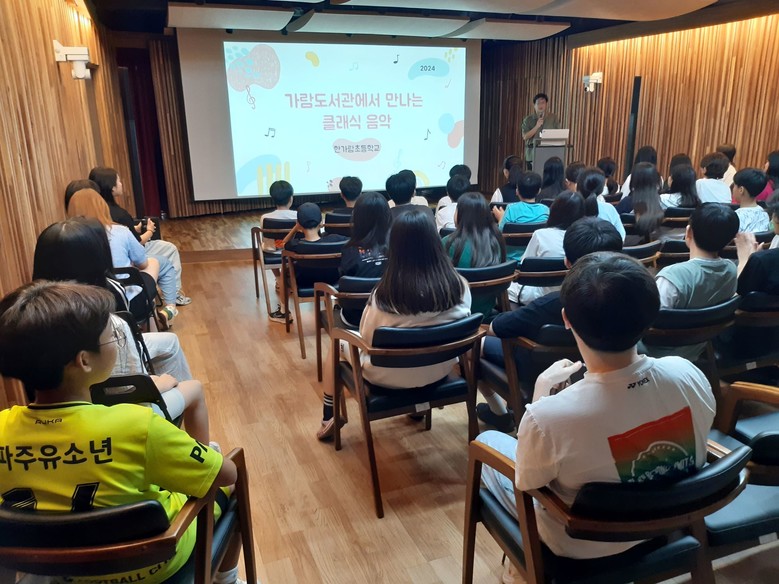 [파주시 세계타임즈=송민수 기자] 한가람초(교장 이강수)는 2024년 6월 13일(목)부터 6월 27일(목)까지 6학년 학생들을 대상으로 클래식 특화 가람도서관 현장체험학습을 진행하였다. 이번 현장체험학습은 가람도서관과 MOU체결로 이루어졌으며, 한가람초의 학교자율과제인 독서와 문화예술교육을 융합한 프로그램으로 기획되어 학생들에게 책과 클래식 음악의 아름다움과 가치를 전달하기 위해 마련된 특별한 프로그램이었다.