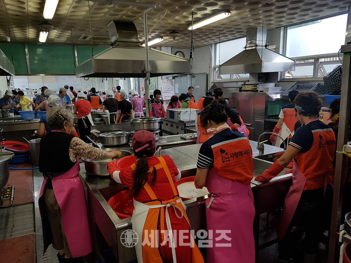 이날 설거지봉사에는 유희자 나눔봉사단장을 비롯해서 20명의 회원들이 더운 날씨에도 불구하고 주방 안에서 구슬땀을 흘려가면서 봉사를 함께 하였다.