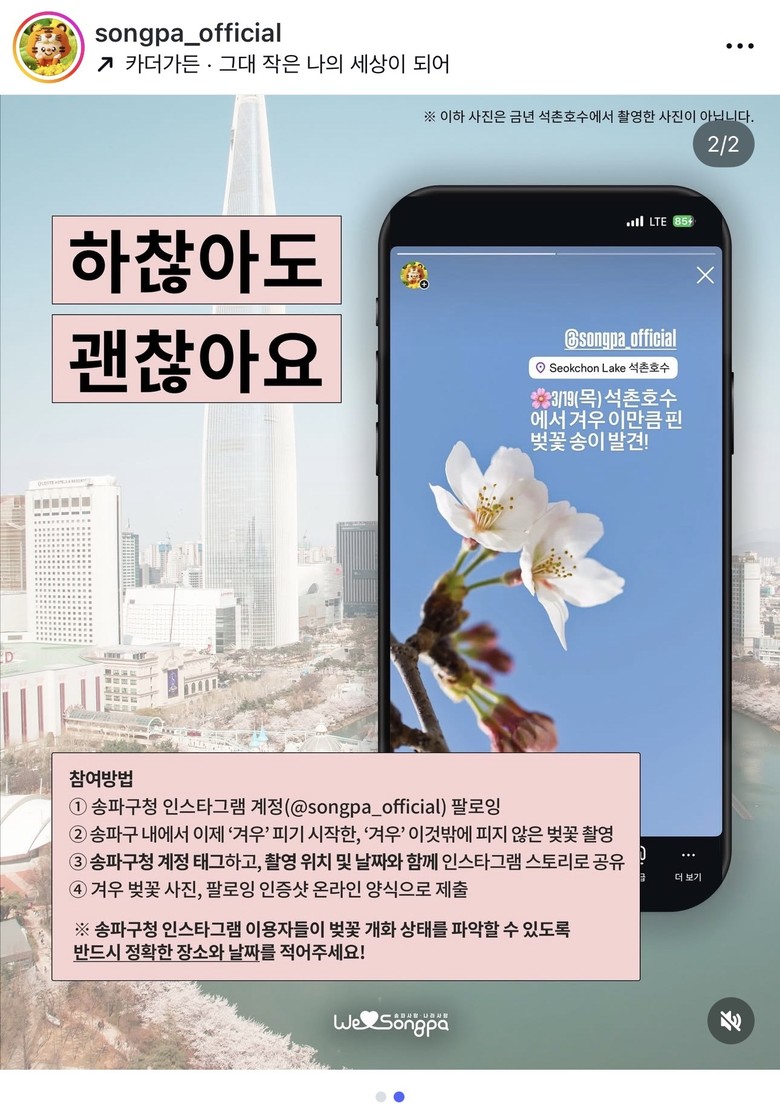 동시에, 호수벚꽃축제를 알차게 즐길 수 있도록 다양한 SNS 프로그램을 준비했다. ▲축제에 대한 모든 정보를 담은 ‘벚꽃축제 완전정복’ 영상 ▲석촌호수 내 개방 화장실 위치 카드뉴스 ▲ ‘송파 SNS 서포터즈 SPARK’가 취재한 풍성한 콘텐츠 등이 예정돼 있다.