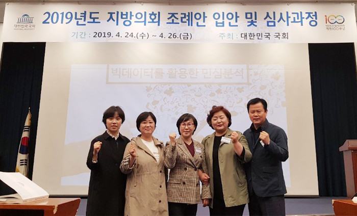 마지막 4월 26일 셋째 날은 첫째 날에 이어 권칠승 국회의원과의 만남의 자리를 가진 후 다음소프트 권미경 이사의 “빅데이터를 활용한 민심분석”, 국회고성연수원 김태환 교수의 “최신 주민복지 조례제정 동향 소개”를 끝으로 3일간의 교육 과정을 수료하였다.