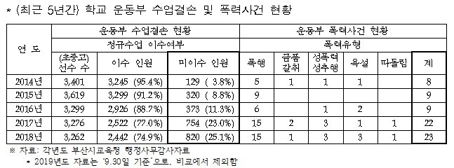 이에 부산시의회 이주환 의원은 “부산시교육청은 매년 행정사무감사자료 등을 통해 학생선수의 수업결손 예방 및 (성)폭력 근절을 위한 다각도의 대책을 마련하여 추진하고 있다고 하지만 관련 문제가 개선되지 못하고 더 악화되고 있는 상황에 대한 부산시교육청의 설명이 필요하다”며,