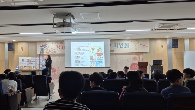 행사는 작가 강연 – 학생 질의응답 – 책 속 장면 나눔 - 퀴즈·뽑기 독서 이벤트 – 사인회 및 사진 촬영 순으로 진행되었다. 김리라 작가는 로봇 형제 캐릭터가 탄생한 배경과 작품에 담은 마음을 학생들이 이해하기 쉽도록 설명하며 큰 호응을 얻었다. 이어진 질의응답에서는“왜 형은 로봇으로 설정했나요?”,“작가가 되려면 어떻게 해야 하나요?”등 학생들의 다양한 질문이 이어져 활발한 소통이 이루어졌다. 또, 책 속 장면 나눔 활동을 통해 학생들은 서로의 다름과 관계를 바라보는 태도에 대해 더 깊이 생각해 보는 시간을 가졌다.