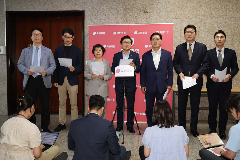 26일 서울 여의도 국회에서 박형수 의원 등 국민의힘 법제사법위원회 위원들이 추미애 위원장의 회의 진행 방식과 관련 규탄 성명을 발표하고 있다. 2025.8.26