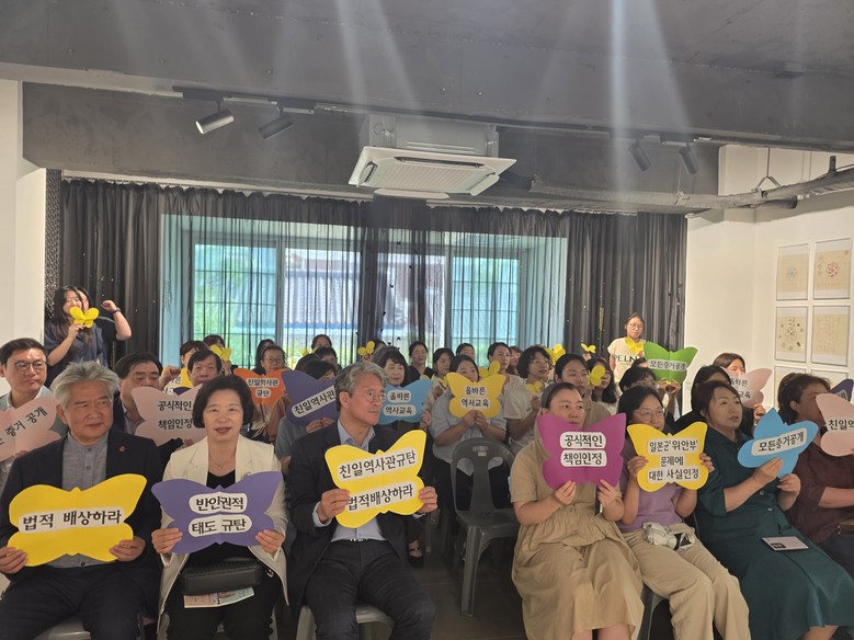 행사에는 도내 여성단체와 시민사회단체, 광복회 전북지회, 전북겨레하나 등 60여 명이 참석해 피해자들의 고통과 용기를 되새겼다. 추모사와 전시 작가 소개, 피해자를 기리는 퍼포먼스가 이어지며 현장 분위기를 더했다.