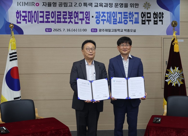 [광주 세계타임즈=손권일 기자] 광주제일고등학교(이하 광주제일고)와 한국마이크로의료로봇연구원(KIMIRo)은 지난 16일 박종오실(AI팩토리실)에서 광주제일고 교장 이규연, 한국마이크로의료로봇연구원 박종오 원장 등이 참석한 가운데 ‘자율형 공립고 2.0’ 사업 지원을 위한 업무협약(MOU)을 체결했다.
