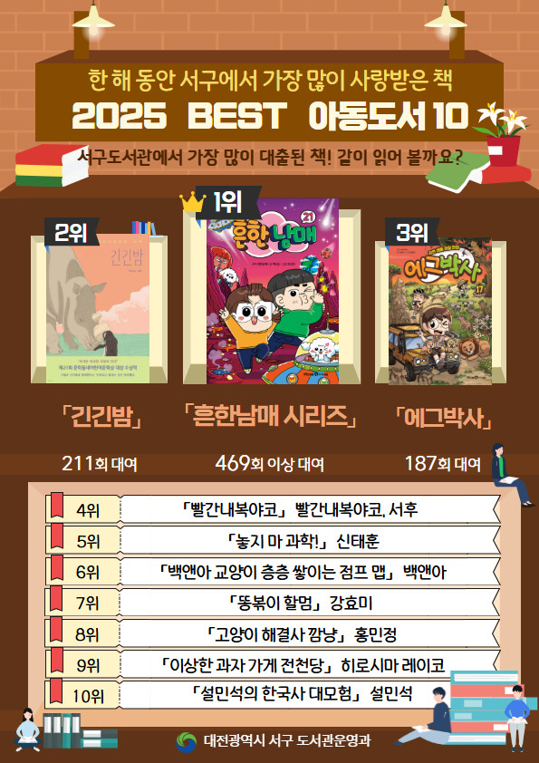 「흔한남매」시리즈는 유튜브 콘텐츠를 기반으로 한 친숙한 캐릭터와 일상적인 이야기로 어린이 독자들의 마음을 사로잡았다. 「흔한남매 과학 탐험대」, 「흔한남매의 흔한 호기심」 등 관련 시리즈 대부분이 높은 순위를 차지했다. 「긴긴밤」은 읽기 쉬우면서도 깊이 있는 서사로 세대 구분 없이 폭넓은 독자들의 사랑을 받았다.