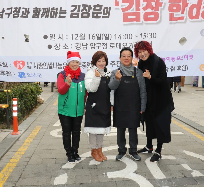 배추는 매년 해 왔듯이 한솥도시락에서 전량 기부로 추운 날씨에도 불구하고 김장훈 낭만 회원 봉사대, 마홍배 사랑& 희망 나눔 운동본부 총재 변애련 밀알 글로벌 다문화 총 연합회 중앙회 회장 압구정 주민 자원봉사단 압구정 로데오 상인들이 함께 했다